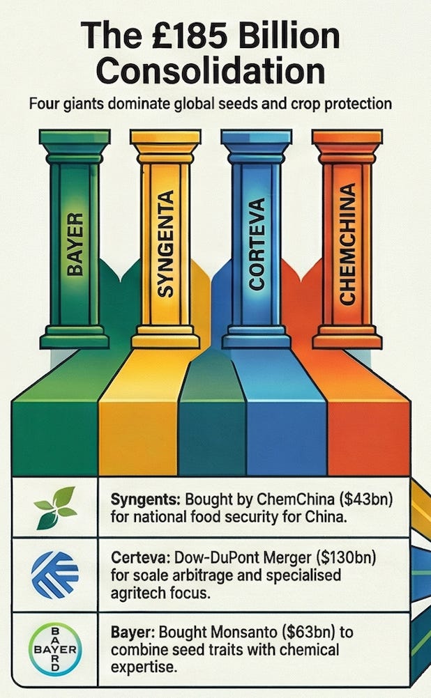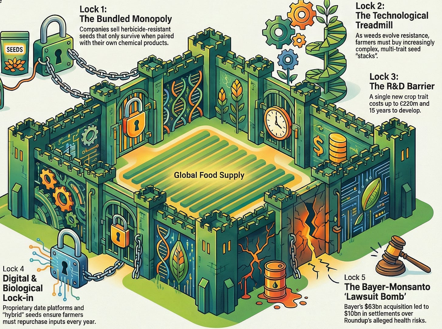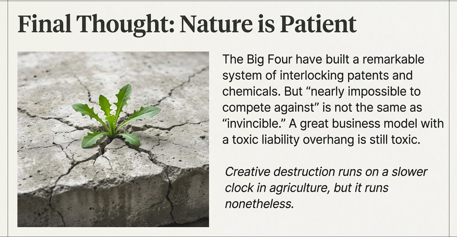 The four companies feeding the world have built something remarkable—a system of interlocking patents, chemicals, seeds, data, and relationships that’s nearly impossible to compete against. But “nearly impossible” isn’t the same as “invincible.”