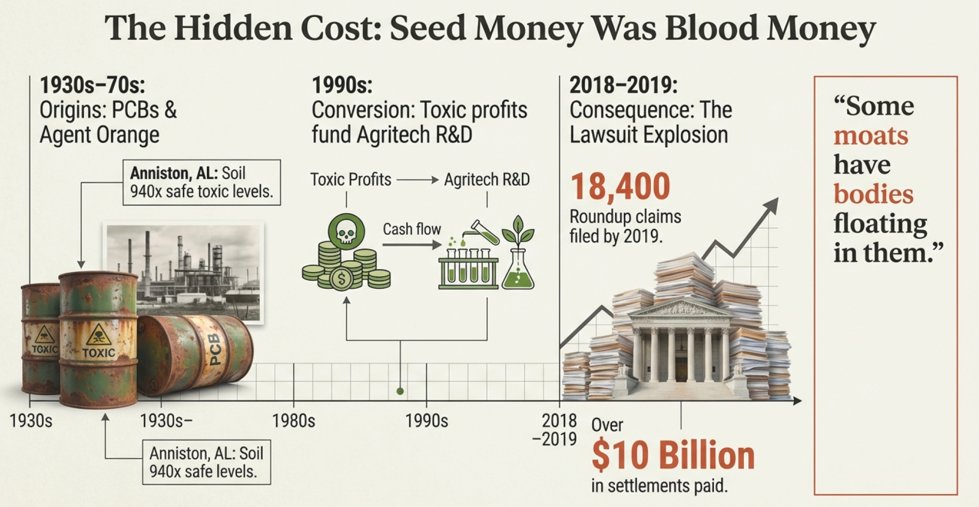 Those toxic profits were “seed money” that funded the agricultural empire. When you’re studying business moats, remember this—sometimes the fortress was built with blood money, and those liabilities never fully disappear.