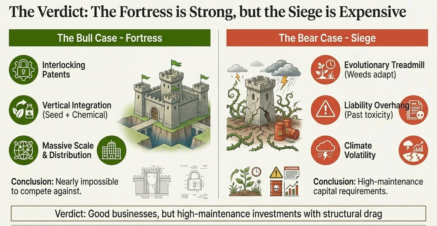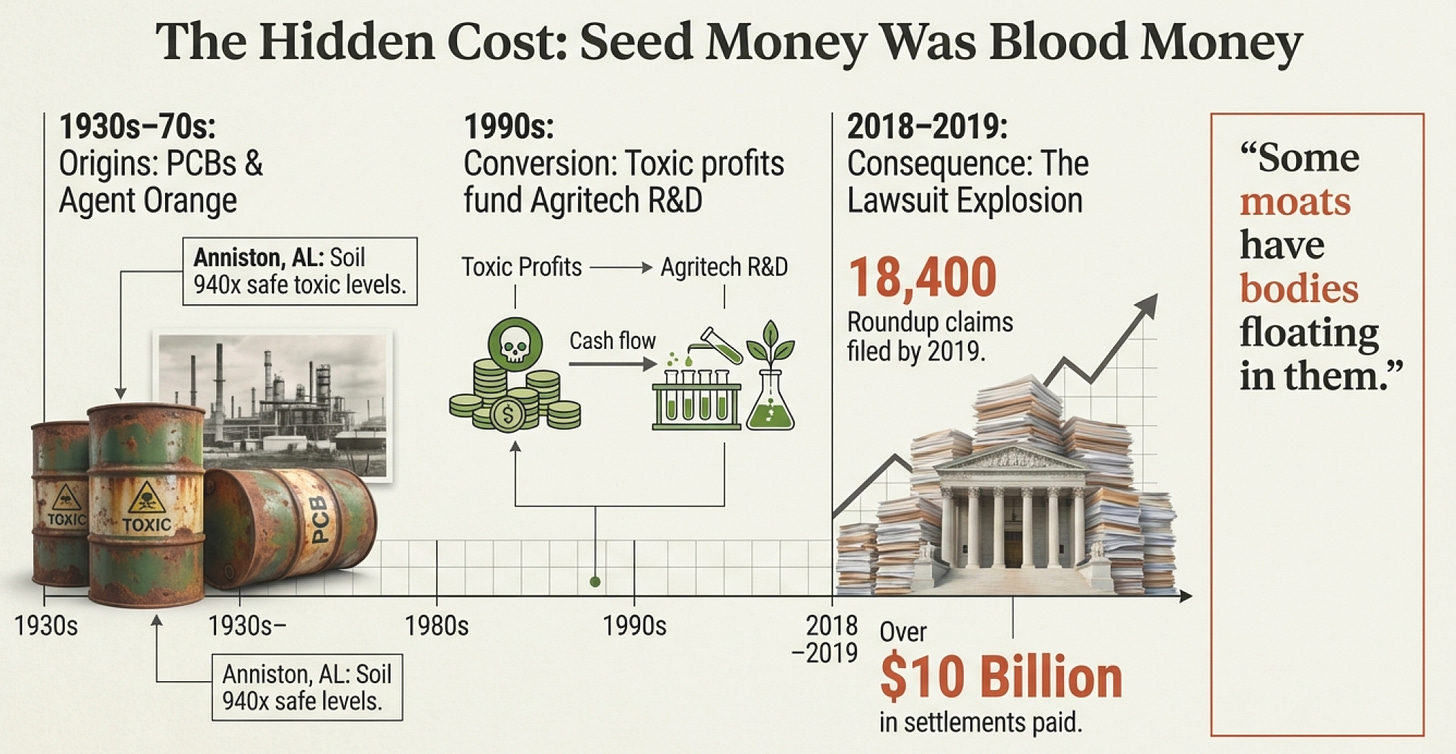 That’s the real lesson of Bayer’s $63 billion disaster. They understood Monsanto’s moats. They just didn’t understand that some moats have bodies floating in them, and sometimes those bodies float to the surface at the worst possible time.