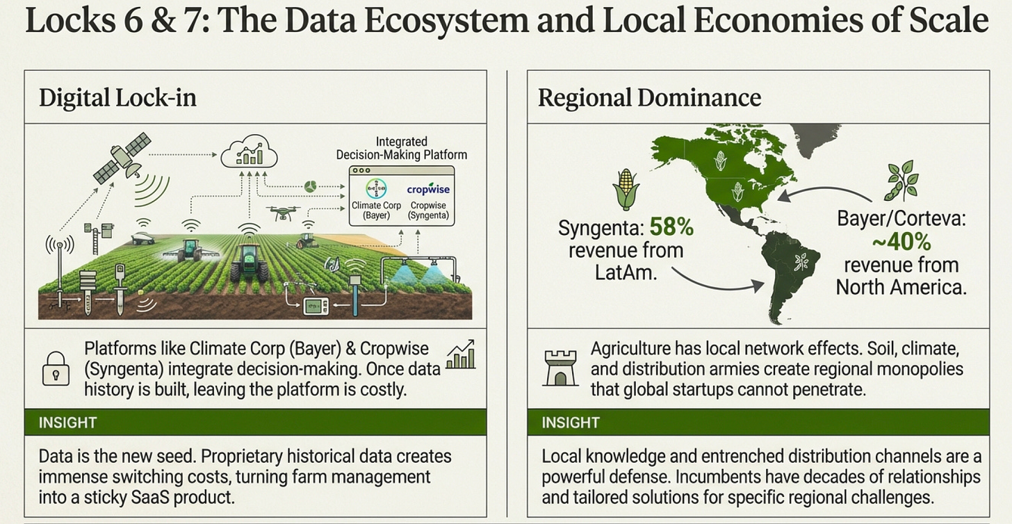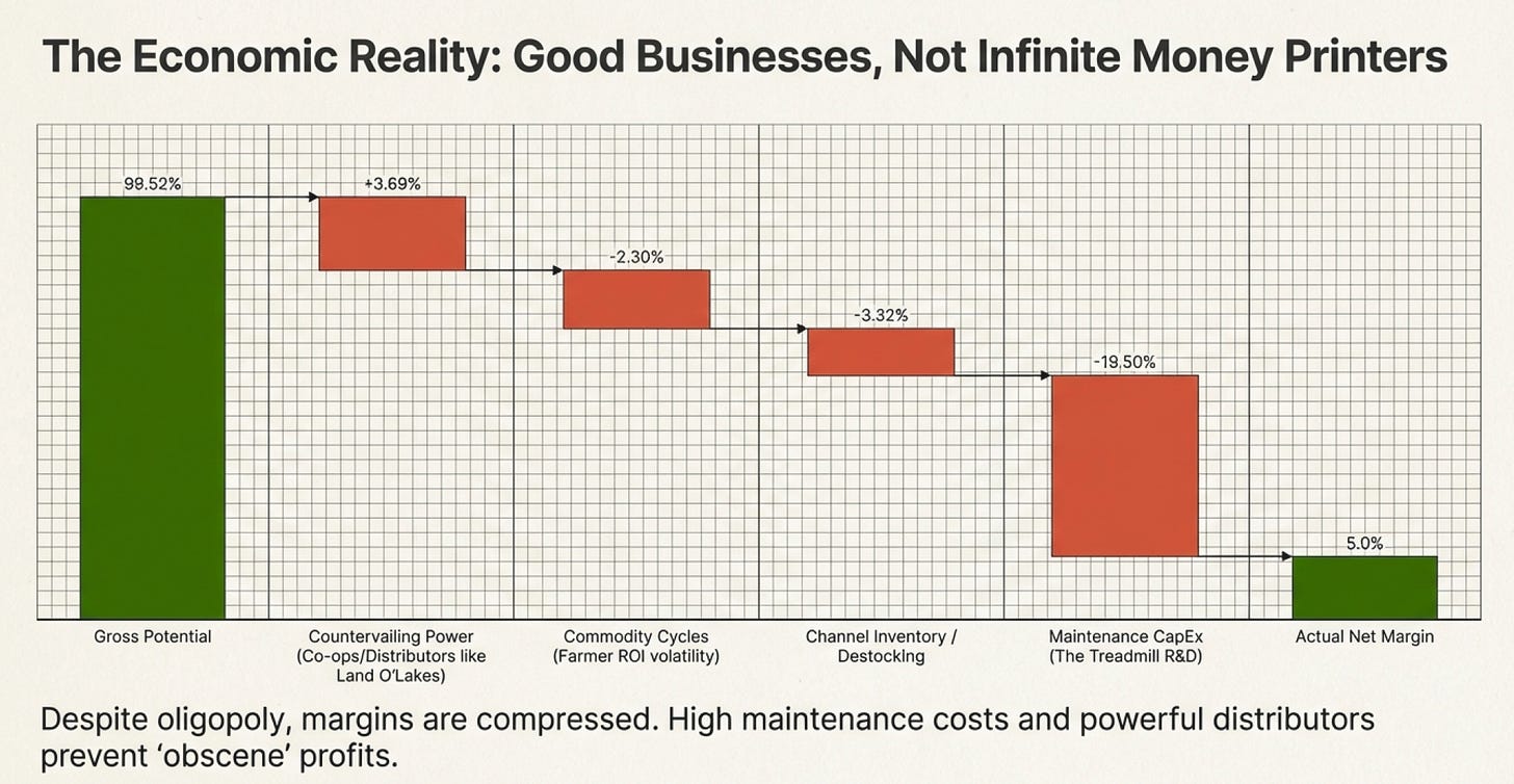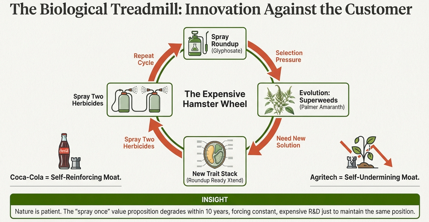 Exceptional breakdown of how agritech moats actually work. The Palmer amaranth example nails something most people miss--these aren't self-reinforcing moats like Coke's brand, theyre self-undermining ones that require constant R&D just to maintain position. Ive followed this sector for a while and the treadmill economics are wild when you see how quickly resistance develops.