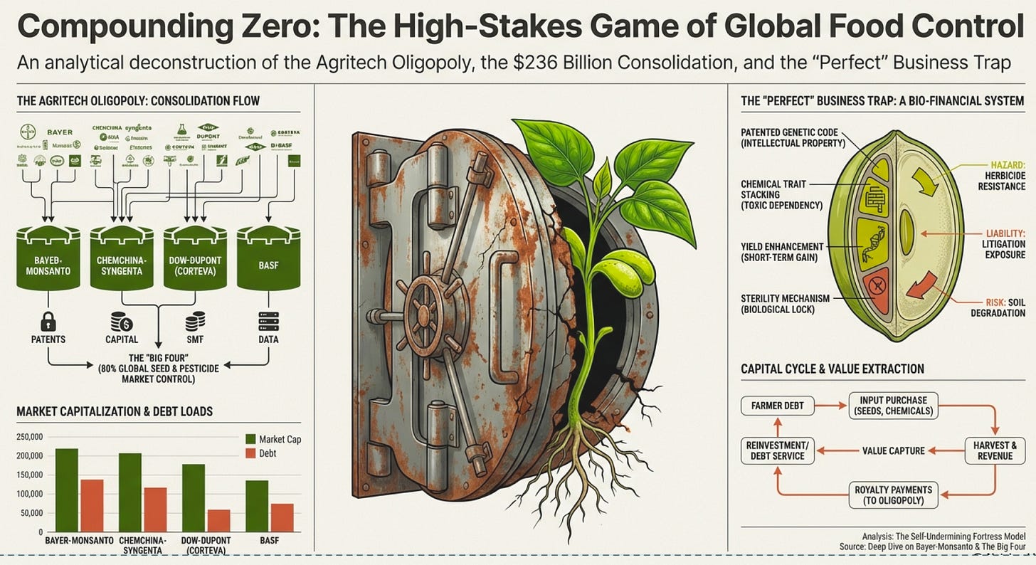 But here’s the twist that makes this story interesting: Monsanto wasn’t worthless. The business model was brilliant. So brilliant that even as Bayer hemorrhaged billions in lawsuits, three other companies were simultaneously spending $130 billion (Dow+DuPont) and $43 billion (ChemChina+Syngenta) to build the exact same type of business.