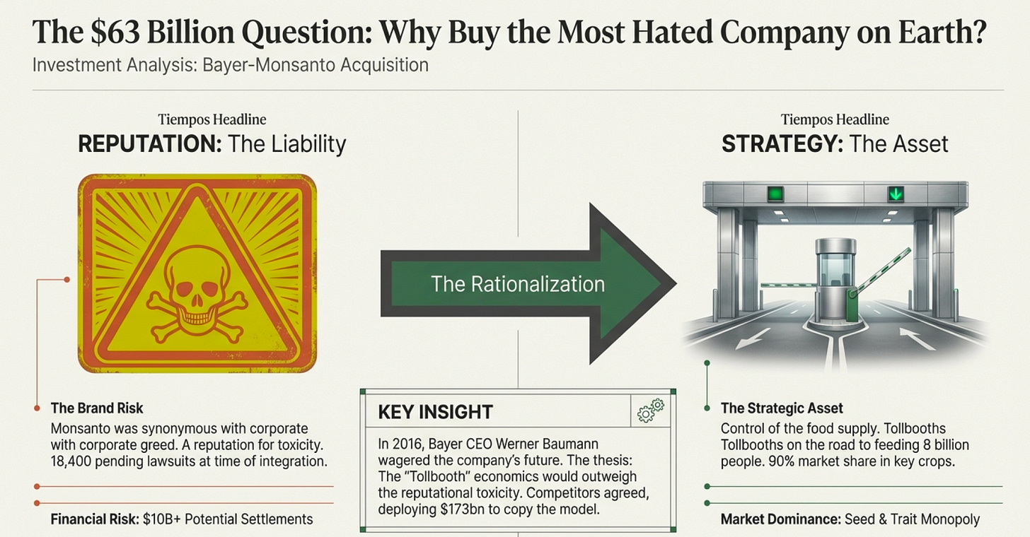 Here’s a thought experiment: You’re Werner Baumann, CEO of Bayer, sitting in a Leverkusen boardroom in 2016. Your company makes aspirin and blood thinners. Someone slides you a proposal to buy Monsanto for $63 billion—the largest all-cash acquisition in human history. The company you’re buying is so hated that “Monsanto” has become a verb meaning “to destroy with corporate greed.”