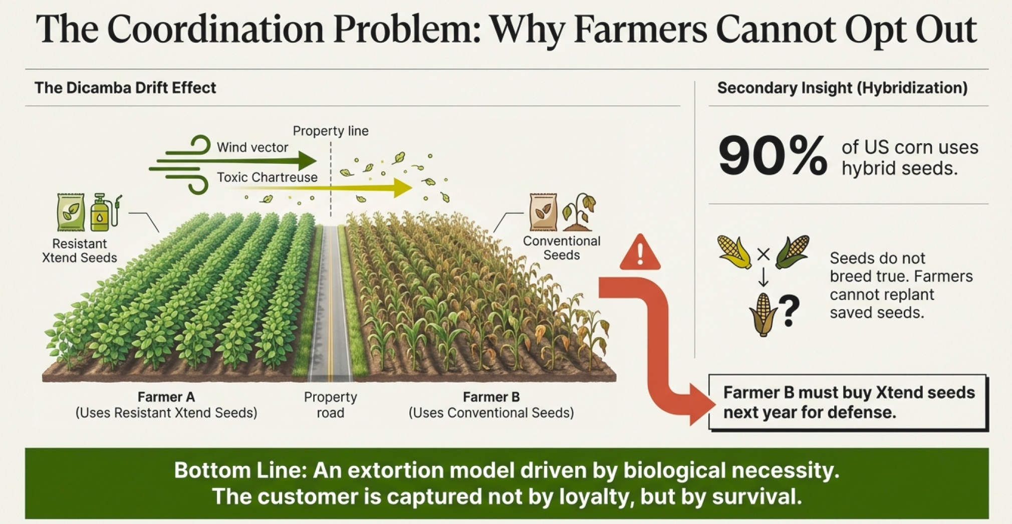 It’s 2016. You’re a corn farmer in Iowa. Your neighbor just planted Roundup Ready Xtend soybeans—resistant to both glyphosate and dicamba. He sprays dicamba on a windy day. The volatile herbicide drifts onto your field. Your soybeans—regular Roundup Ready, not Xtend—are damaged. Yield drops 20%.