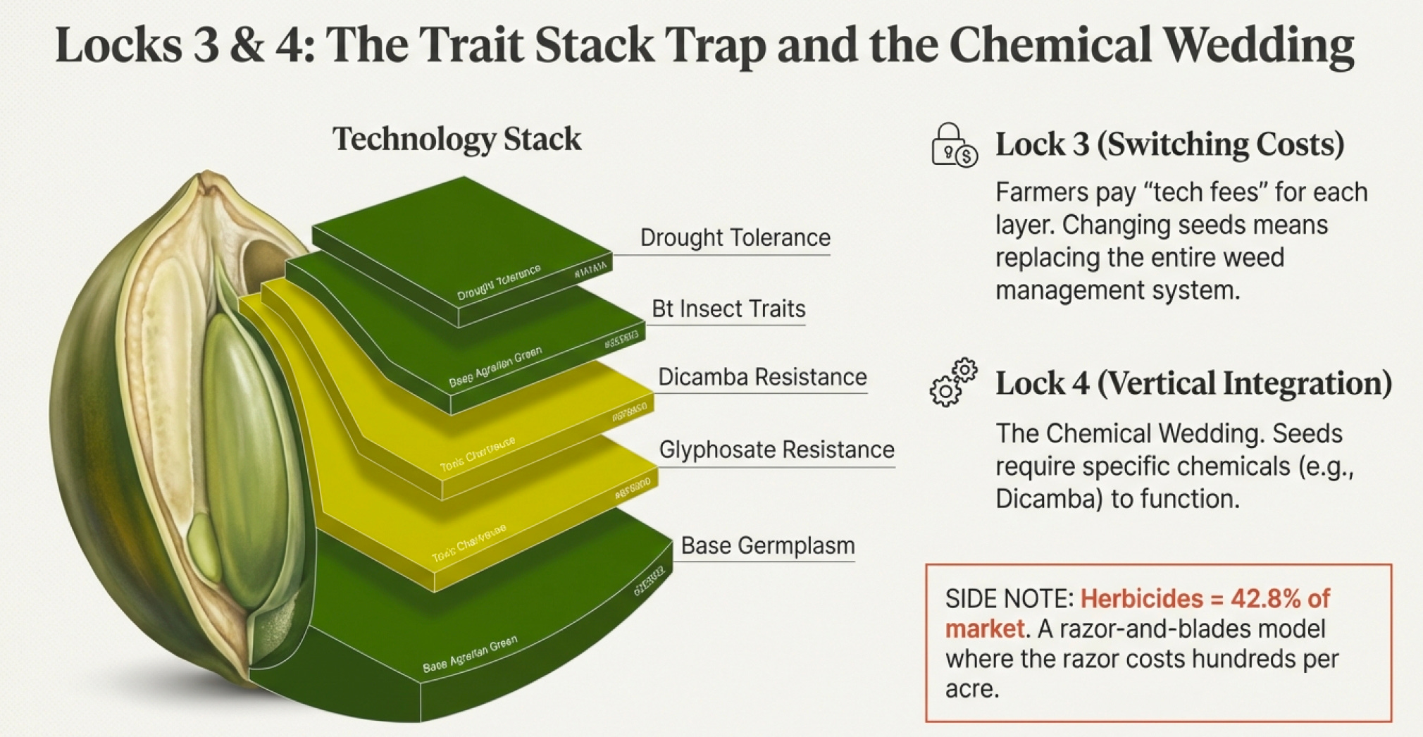 Each generation of traits costs more. Each requires new complementary chemicals. Each locks you deeper into the ecosystem.