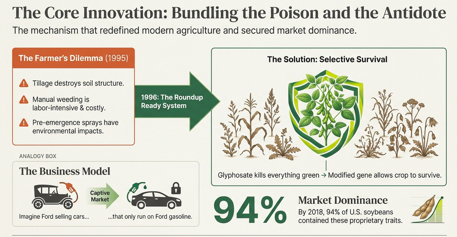 In 1996, Monsanto introduced Roundup Ready soybeans. Genetically modified to resist glyphosate. Now you could spray your entire field during the growing season. The weeds die. Your soybeans laugh at the poison and keep growing.