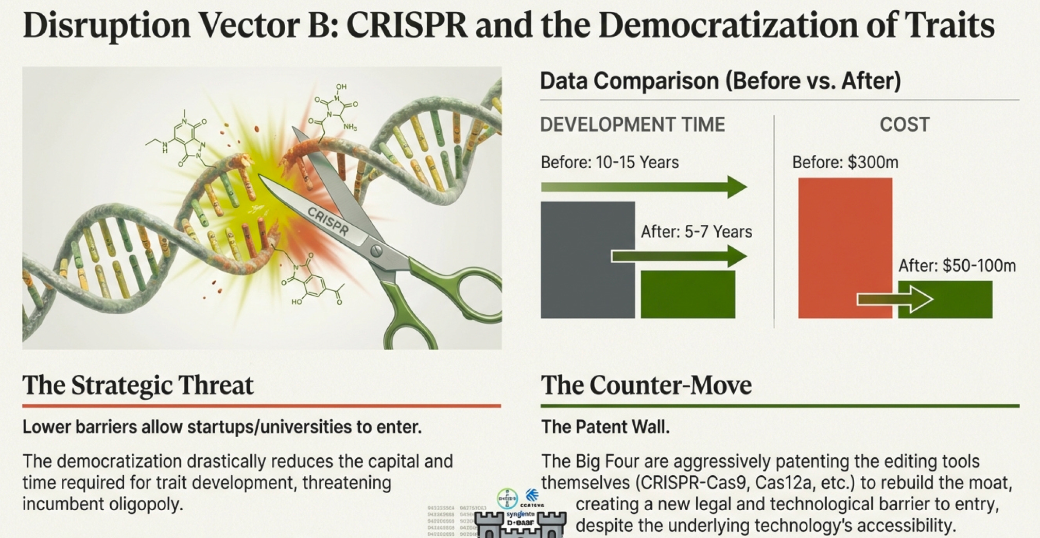 If CRISPR delivers on these promises, it lowers barriers to entry. That’s bad for incumbents. Smaller players could enter the trait development game. University research could commercialize faster. Startups could specialize in specific crops or regions.