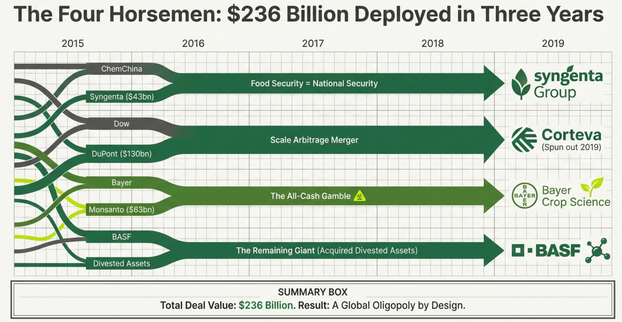 While Bayer was stepping on that landmine, something extraordinary was happening. The entire agricultural input industry was consolidating. And they did it in a three-year span:
