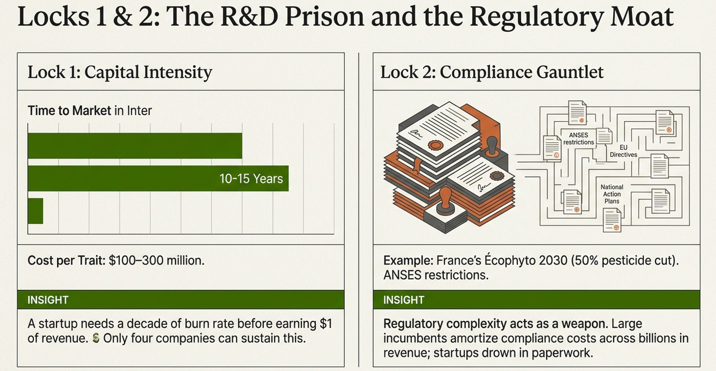 Developing a new crop trait takes 10-15 years and costs $100-300 million. That’s per trait. The combined Bayer-Monsanto entity spent €2.4 billion on R&D in 2017. Syngenta secured over 1,200 product approvals in 2025 alone.