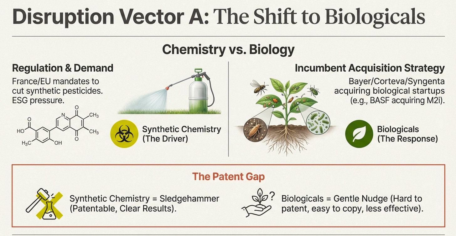 Europe (regulatory nightmare): France mandates 50% cuts in synthetic pesticide use by 2030. ANSES fast-tracks biologicals while banning traditional chemistries. High regulatory costs, uncertain market structure. But also premium pricing for approved products.