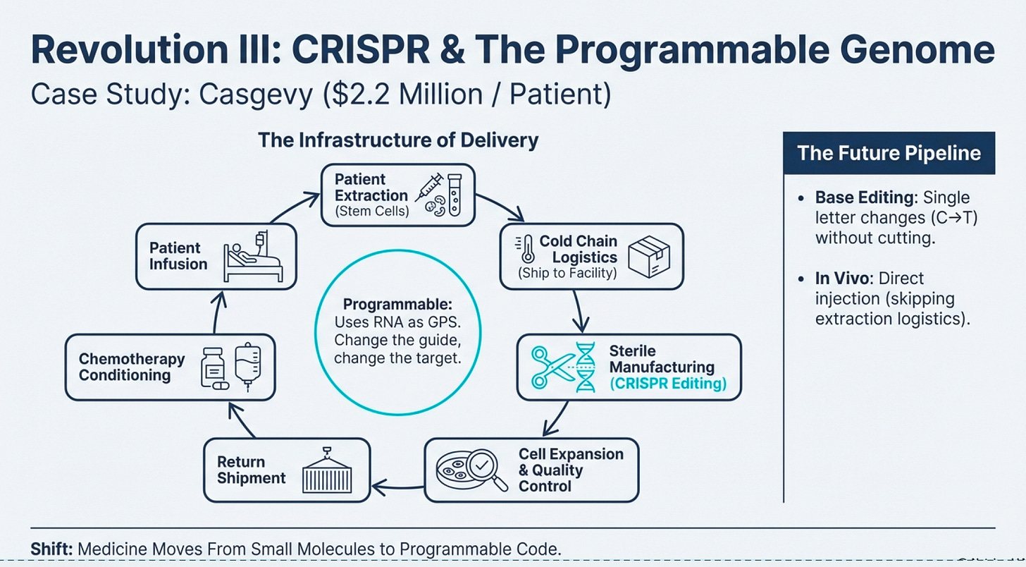 Recombinant DNA wasn’t just insulin; it was a manufacturing method applicable to hundreds of proteins. CRISPR isn’t just a sickle cell treatment; it’s a genome editing platform applicable to thousands of genetic diseases.