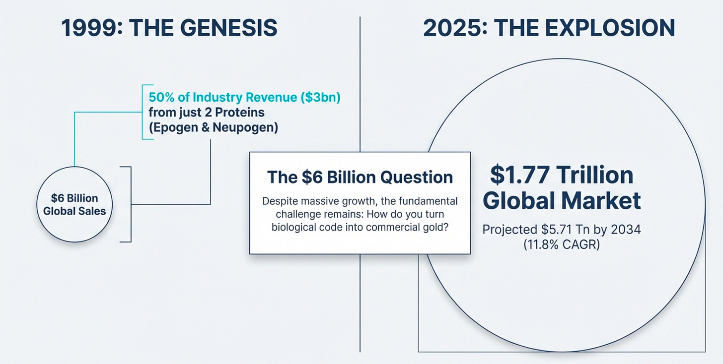 We’ve come full circle to 1999’s $6 billion question, now scaled 295x to a $1.77 trillion industry. The answer remains infrastructure: whoever controls the machinery for turning biological code into commercial products wins.