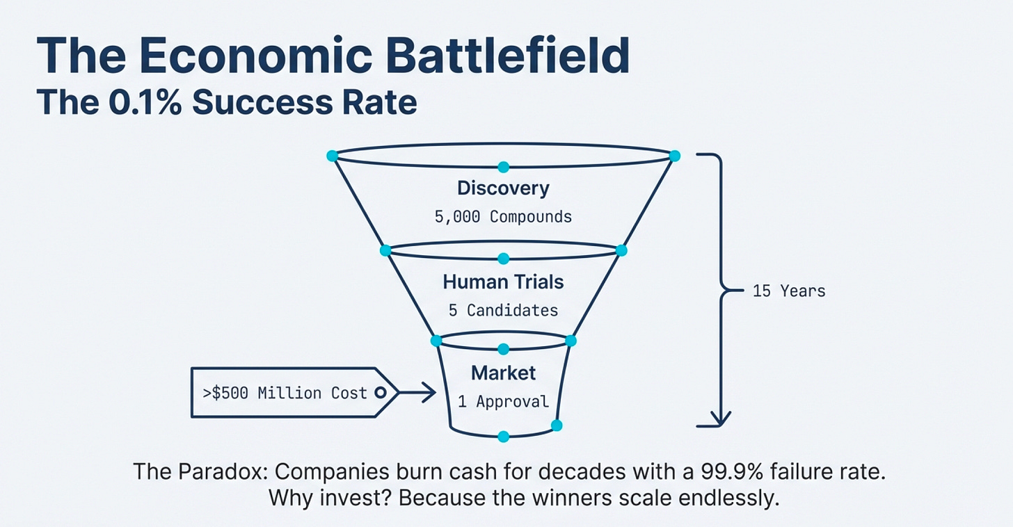 This is why early-stage biotech companies often target rare diseases first: get an approved drug treating 10,000 patients at $300,000/year, and you have a $3 billion revenue stream—with almost no competition and strong patent protection.