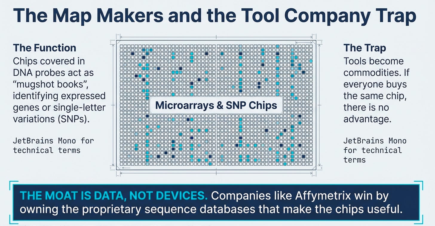 When a tool company licenses its technology to many different drug developers, everyone possesses the same capability. There’s no sustainable competitive advantage. The tool might be cutting-edge today, but in biotech, today’s revolution is tomorrow’s baseline expectation. Unless the tool company has proprietary sequences (like Affymetrix’s agreement with Human Genomics Sciences for access to proprietary database sequences) or some other sustainable moat, it’s fighting commodity economics.