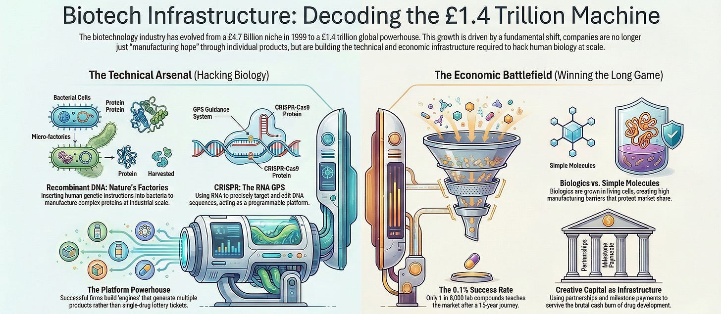 This is the level of infrastructure thinking required in biotech. You’re not just optimizing manufacturing efficiency or distribution networks. You’re wrestling with physics and chemistry at a molecular level. The infrastructure isn’t just factories and supply chains—it’s the fundamental scientific techniques that make biotech possible at all.