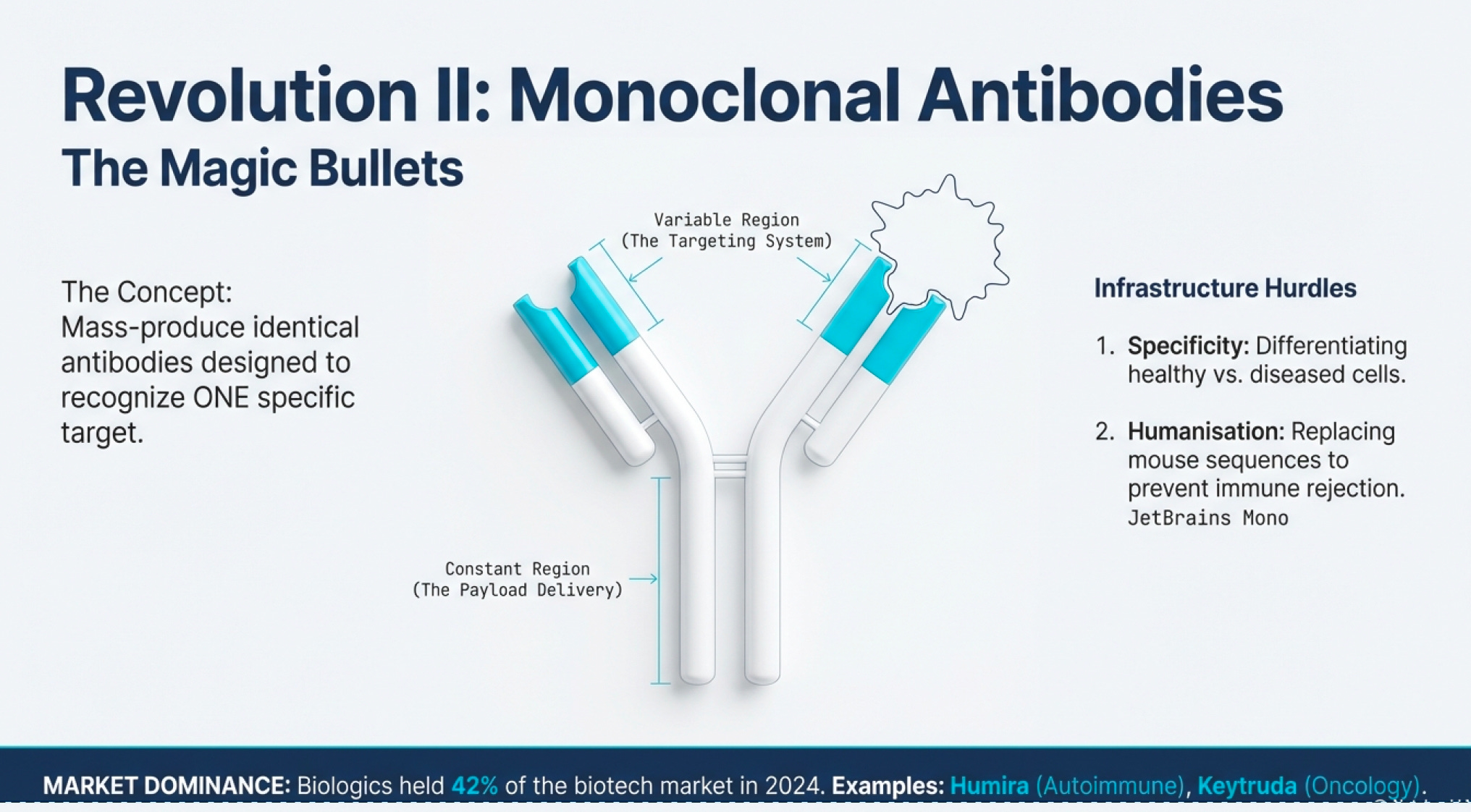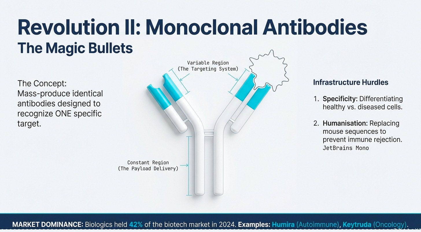 Recombinant DNA solved the protein extraction problem. Monoclonal antibodies solved the targeting problem. CRISPR is solving the genome editing problem. Each innovation becomes infrastructure—the foundation upon which thousands of companies build products.