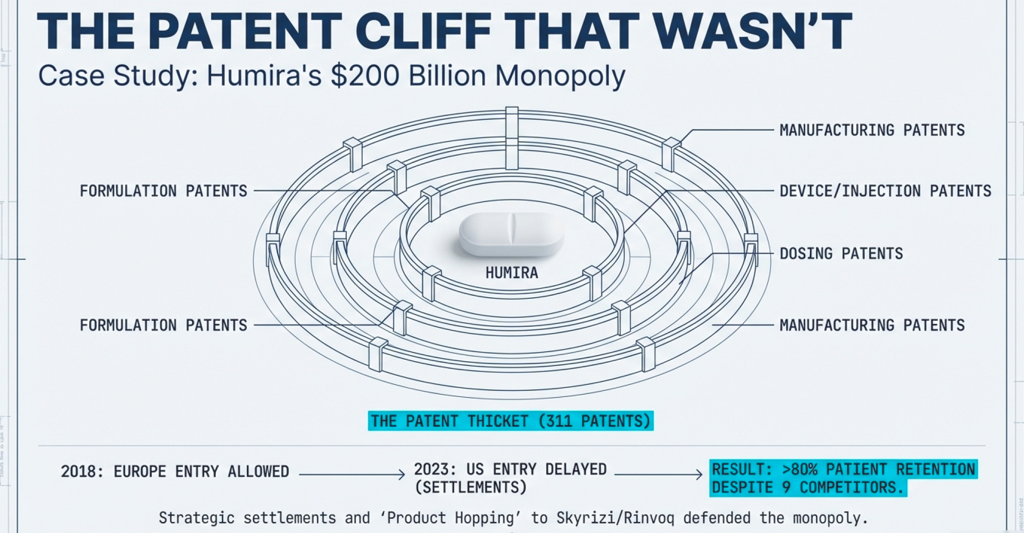 AbbVie’s Humira defense strategy deserves a case study in any business school (though perhaps not an ethics course). The company executed a three-part playbook that delayed U.S. biosimilar competition by five years and generated tens of billions in additional revenue.
