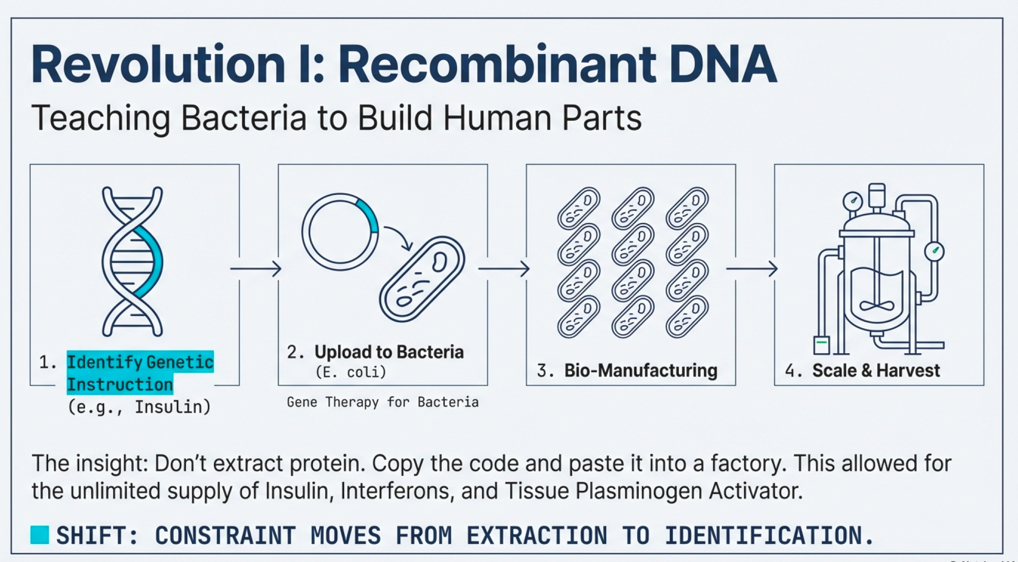 The insight was brilliant in its simplicity: instead of extracting proteins from human tissues, why not copy the genetic instructions for making those proteins and paste them into bacteria? Bacterial cells are nature’s factories. They reproduce rapidly, follow genetic instructions faithfully, and can be grown in massive vats. If you could teach E. coli to make human insulin, you’d have an unlimited supply.