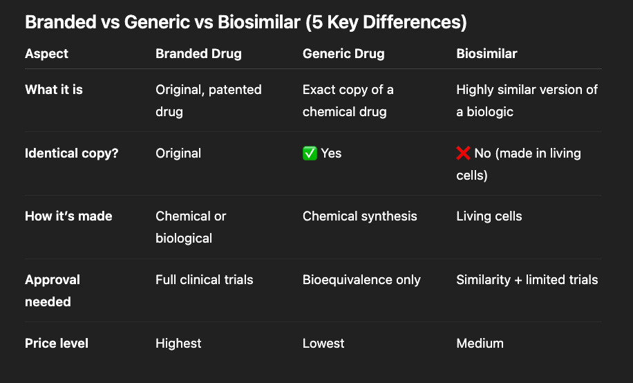 Two proteins with identical amino acid sequences can have different biological effects if they fold differently or have different post-translational modifications (sugars attached, etc.). This is why they’re called “biosimilars” rather than “generics”—FDA-approved biosimilars must demonstrate they are as safe and effective as branded biologics through extensive testing, unlike traditional generics where automatic substitution is allowed.