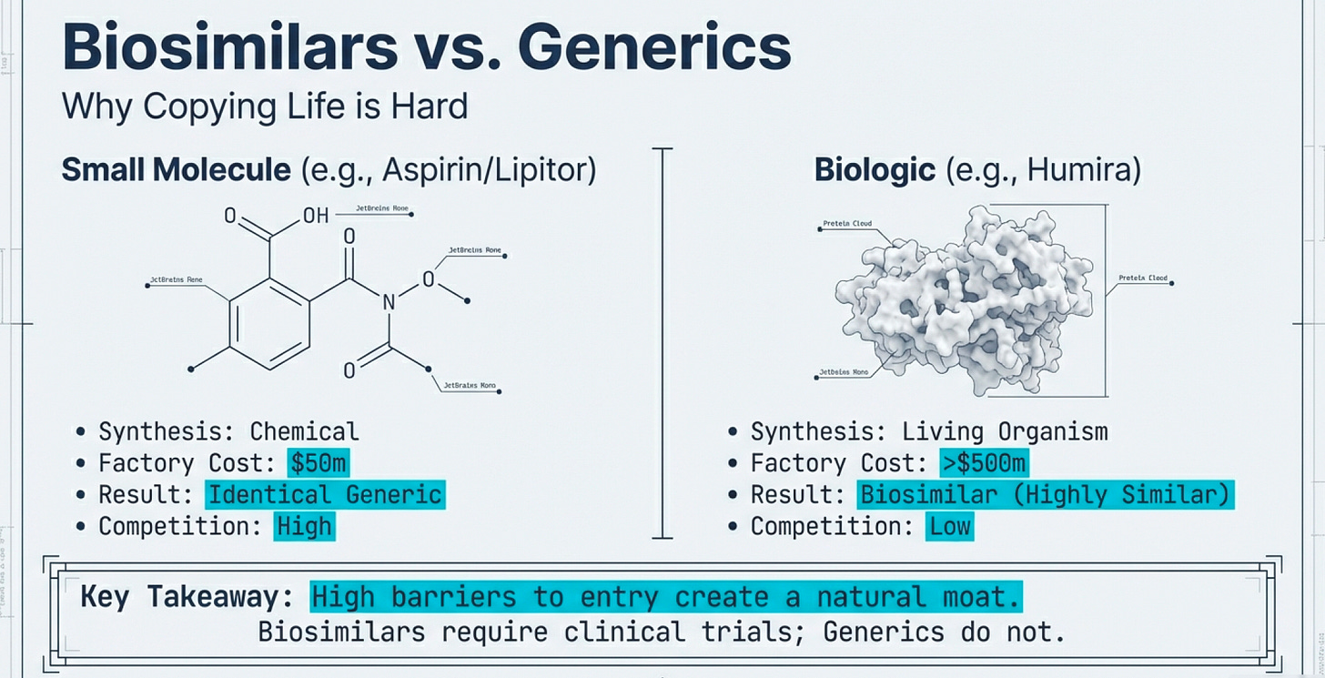 This wasn’t incompetence by biosimilar manufacturers. It wasn’t even primarily about AbbVie’s aggressive contracting tactics (though those helped). It was about a fundamental infrastructure reality: biosimilars are much harder to make than traditional generic drugs, resulting in fewer competitors.