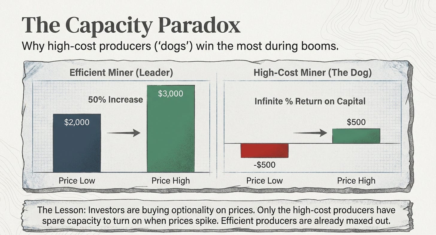 This is why the “dogs” of commodity sectors often outperform during booms. They have dormant capacity that becomes wildly profitable when prices spike. The efficient producers are already maxed out.
