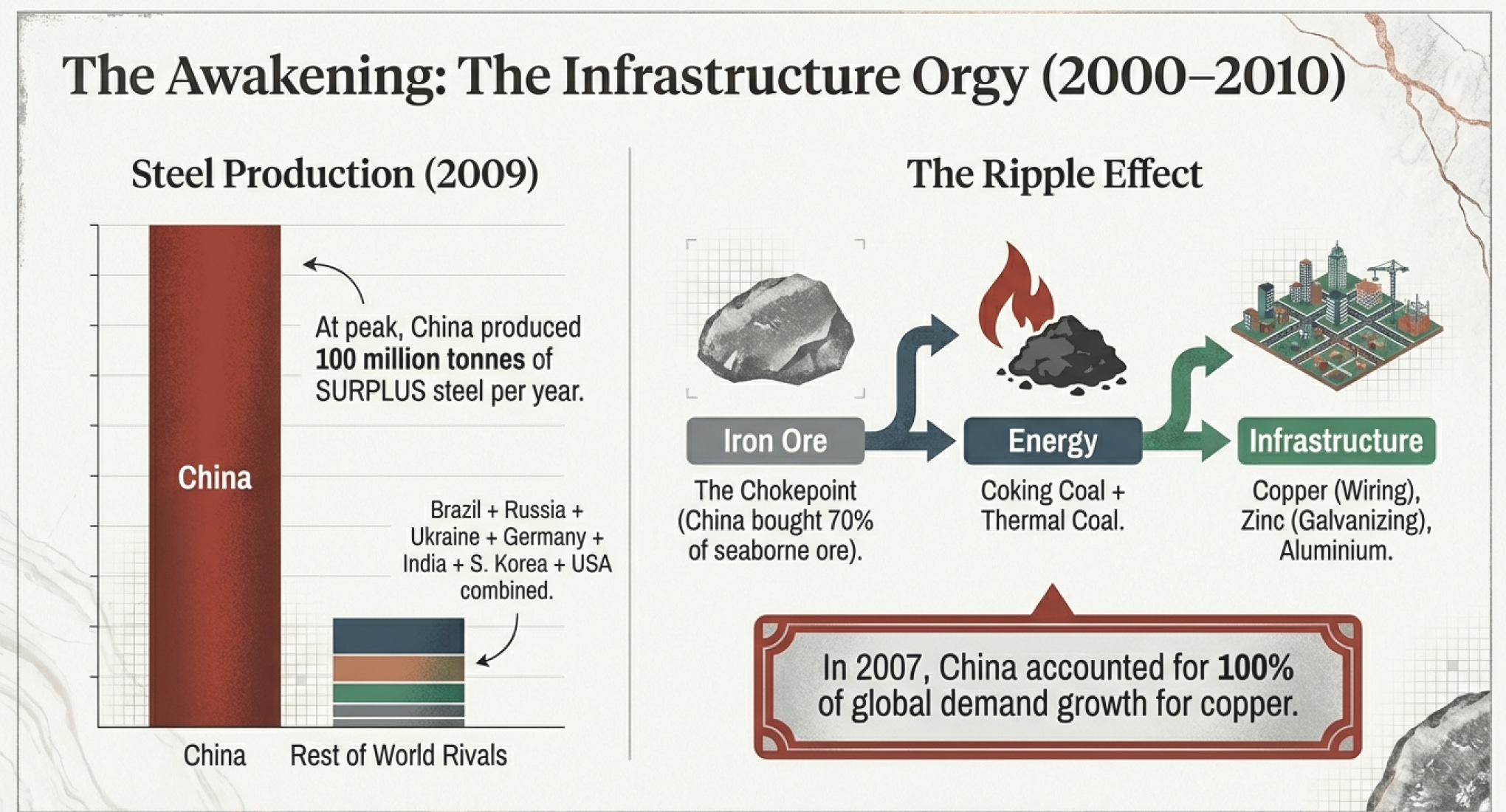 This is why Stern Hu’s arrest mattered. Iron ore was the chokepoint—the essential raw material that everything else depended on. And China had a problem: They were buying 70% of all seaborne iron ore, but they were negotiating from a position of spectacular weakness.