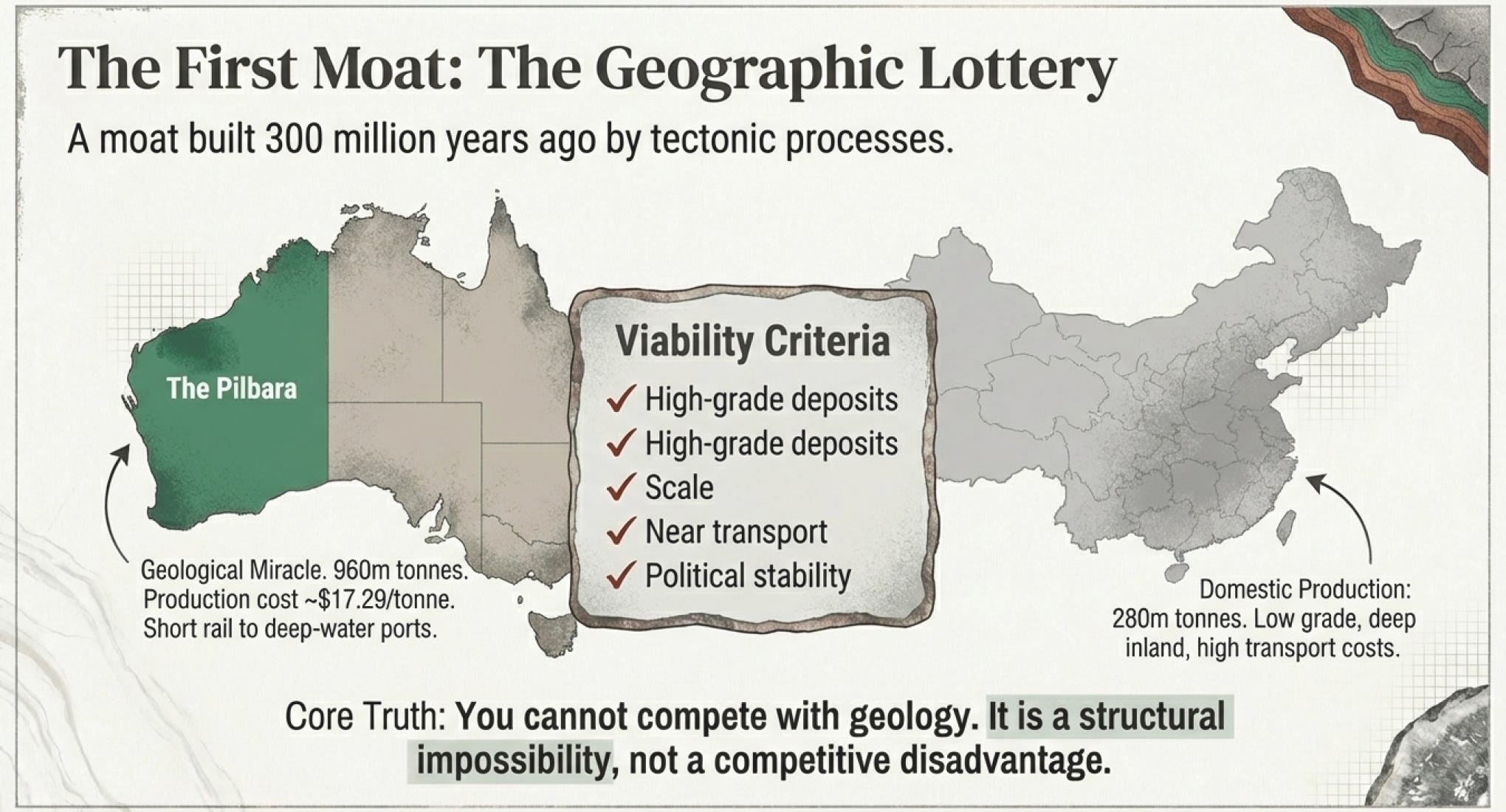 This is what I call the Geographic Lottery—a moat that was built for you 300 million years ago by tectonic processes you didn’t control, can’t replicate, and which your competitors cannot overcome no matter how smart they are or how hard they work.