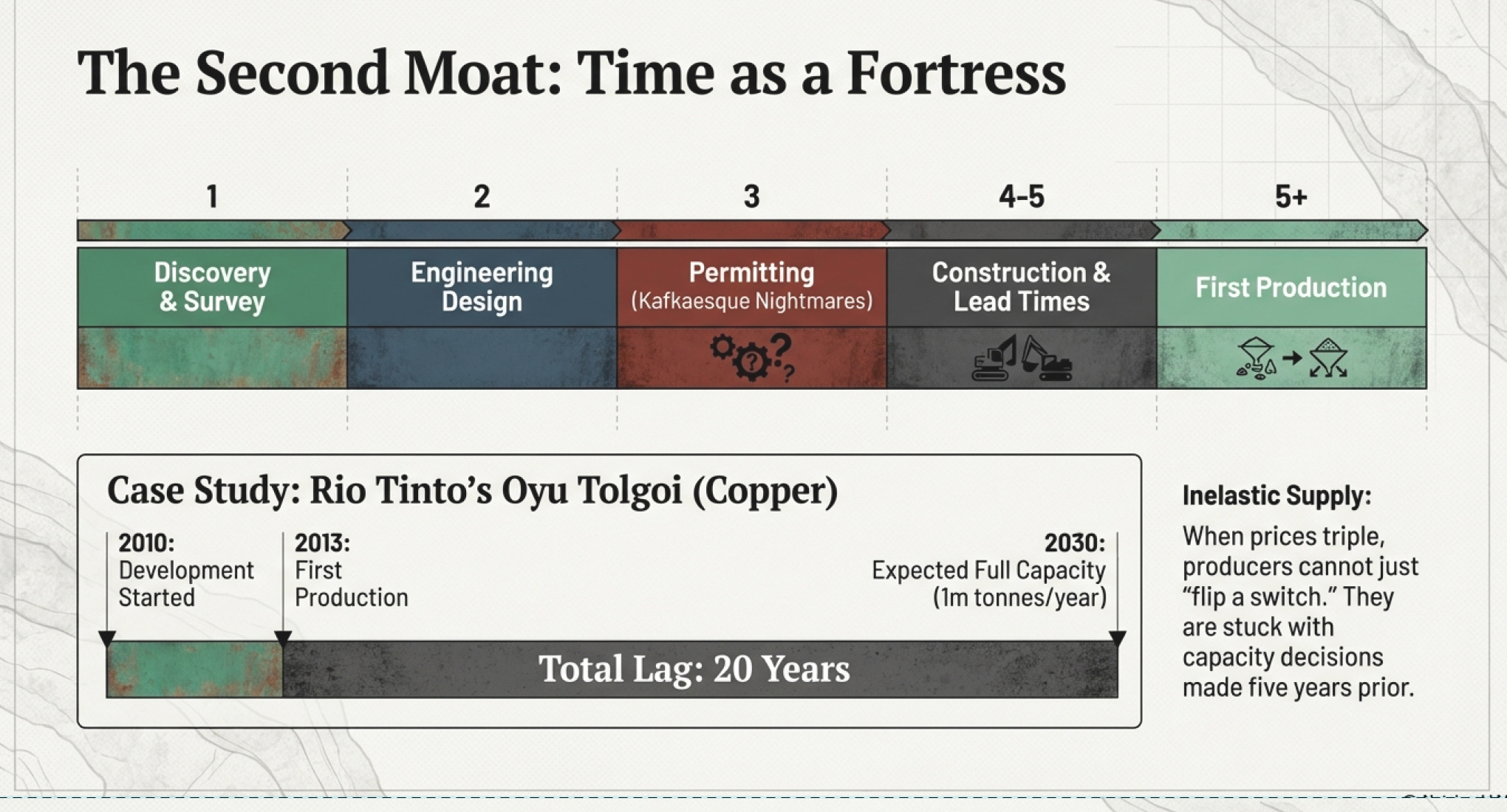 The moats in commodity businesses are different from those in consumer brands or software companies. They’re not about switching costs or network effects. They’re about geology, time, infrastructure, and the brutal physics of digging things out of the ground and turning them into usable materials.