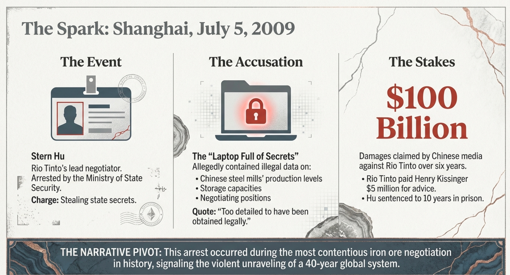 But here’s what makes this more than just another corporate scandal: Stern Hu’s arrest happened to occur during the most contentious iron ore price negotiations in modern history, just weeks after those negotiations had spectacularly collapsed, and mere months after Rio Tinto had walked away from a $19.5 billion investment from China’s state-owned Chinalco—a decision that enraged Beijing.