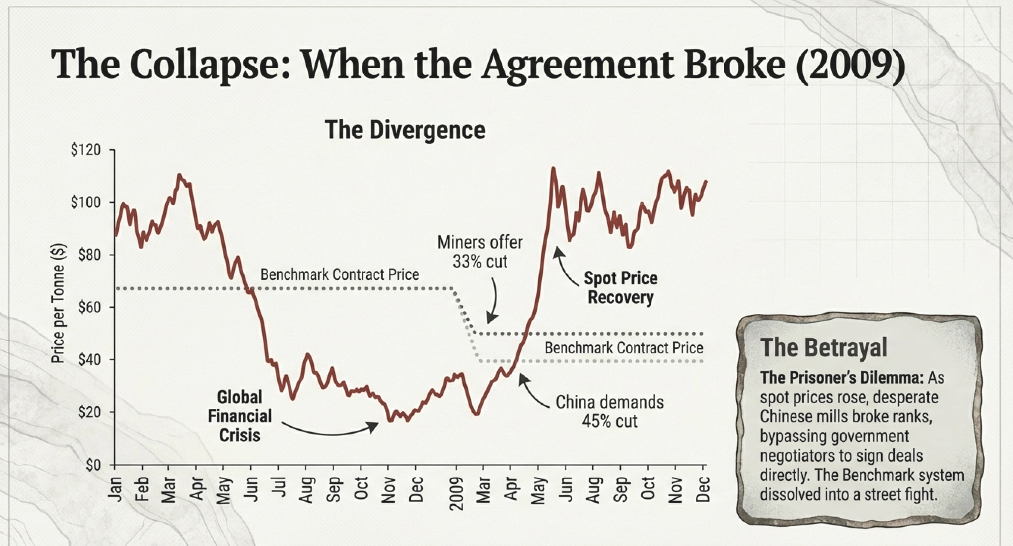 Iron ore prices had surged in 2008 as China’s infrastructure boom accelerated. But in late 2008, the global financial crisis hit. Spot prices for iron ore tumbled 70% from 2007 to 2008. Chinese steel mills, seeing the crash, demanded price cuts of 40-45% in the 2009 benchmark negotiations.
