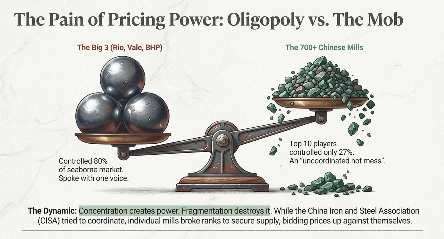The miners spoke with one voice through Rio Tinto, Vale, and BHP. The Chinese mills didn’t speak at all—they screamed individually, each trying to make sure they had enough ore, even if that meant their competitor-neighbors paid less.