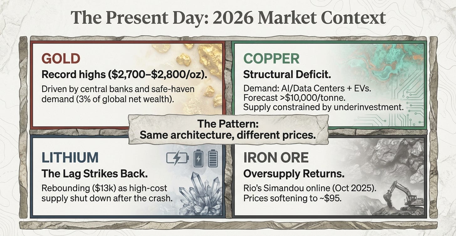 Each of these stories is unique. But each reveals the same underlying architecture: Supply determined by geological accident and five-year lead times. Demand determined by economic growth, technology shifts, and China. Prices determined by the interaction between inelastic supply and volatile demand. And profits captured by whoever controls the irreplaceable assets with the lowest costs and longest reserve lives.